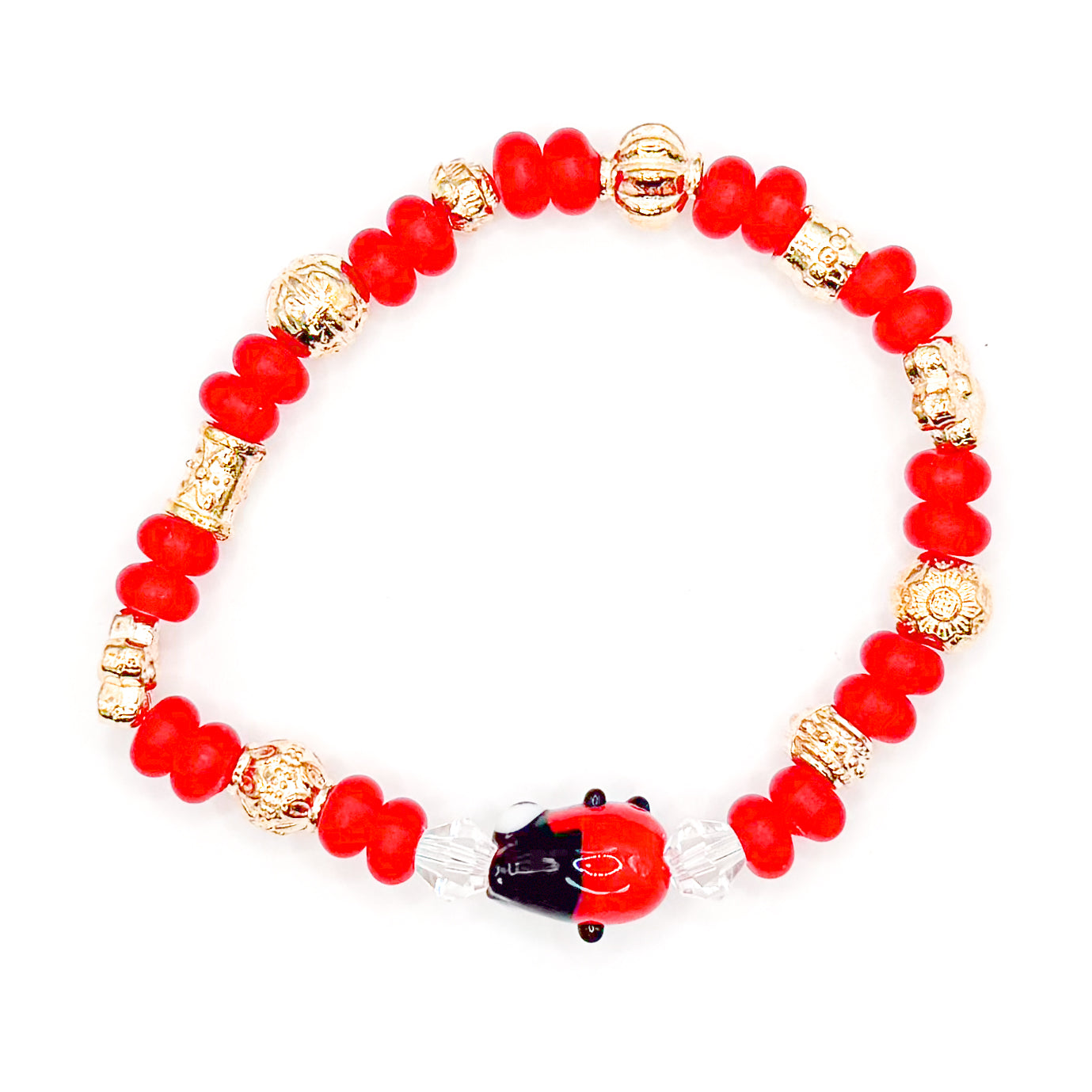 Handmade red glass beaded bracelet with ladybug glass charm || KellyPrepsterStudio