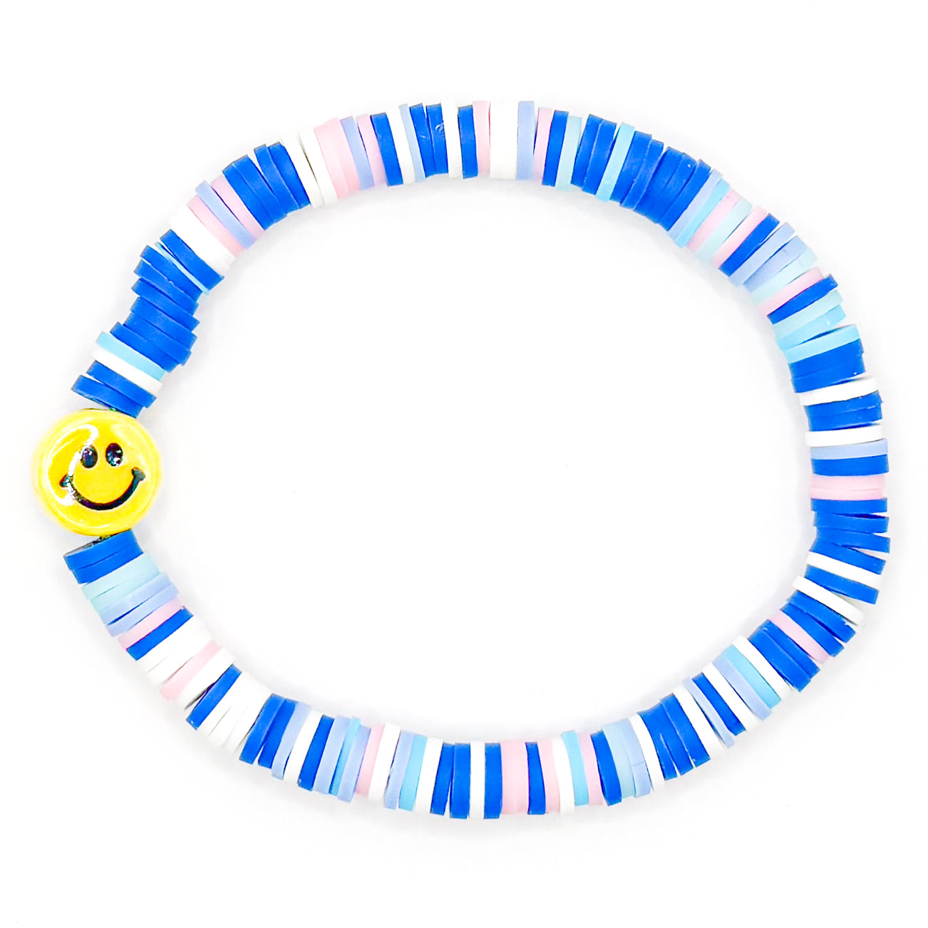 Handmade blue, pink, and white clay beaded bracelet with smiley charm || KellyPrepsterStudio