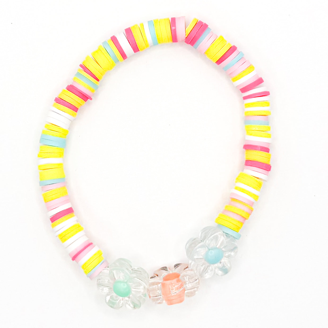 Handmade Yellow, blue, pink, and white clay beaded bracelet with flower charms || KellyPrepsterStudio